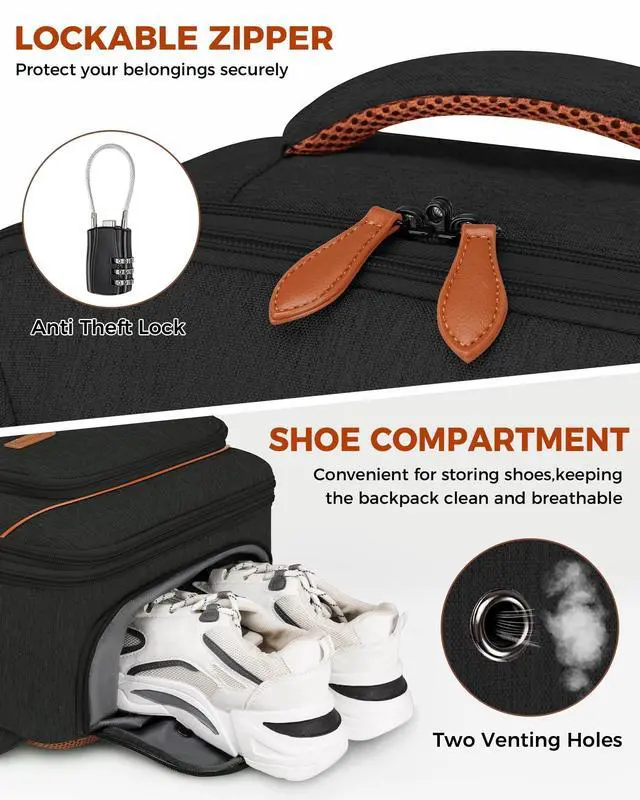 Practical Design: This expandable backpack has a main compartment with a dry and wet pocket for toiletries or dirty clothes, along with elastic straps to keep your items secure. The padded middle main compartment fits a 17.3 -inch laptop, protecting it from bumps. There are extra pockets for keys, headphones, and more. For security, it features a zipper with a lock hole and a combination lock. The side pocket holds an 18 oz water bottle or umbrella ^^ Convenient and