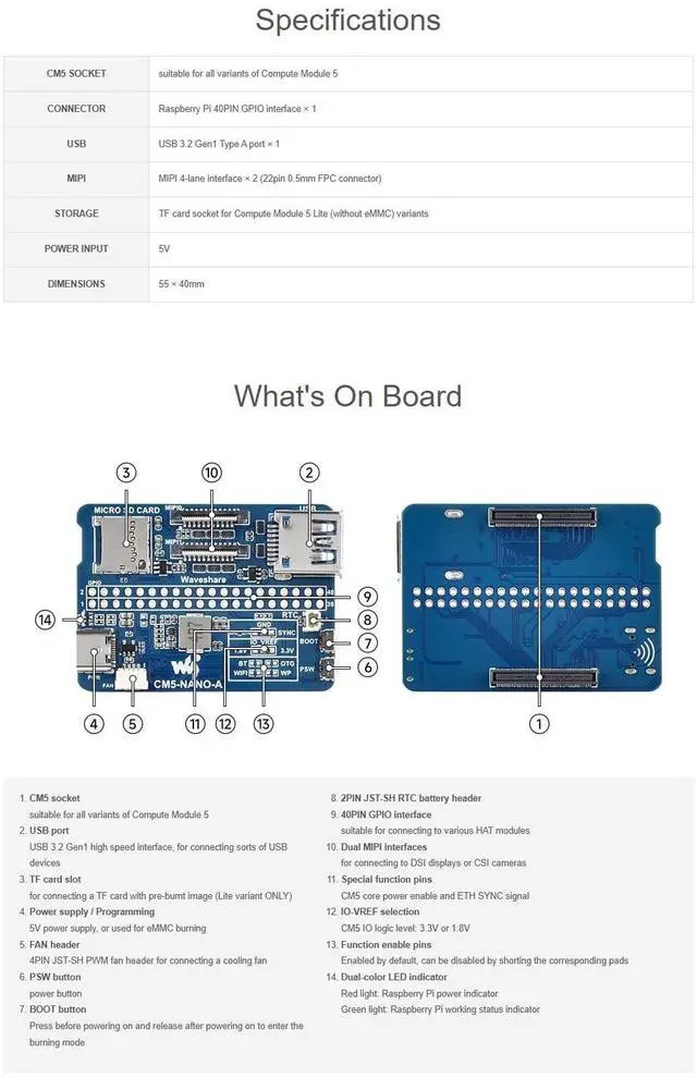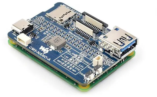 CM5 Compatibility: Equipped with a dedicated CM5 socket, this base board supports all Compute Module 5 variants. Use the TF card slot for CM5 Lite models or leverage onboardeMMC support for streamlined deployment.