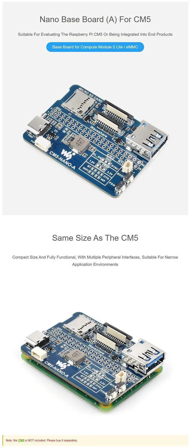 OverviewThe CM5-NANO-A Nano Base Board is a high-performance, compact development platform designed exclusively for the Raspberry Pi Compute Module 5 (CM5). Measuring the same size as the CM5 itself, this ultra-slim base board delivers full functionality for evaluating CM5 Lite (without eMMC) and CM5 eMMC variants orintegrating them into final products.