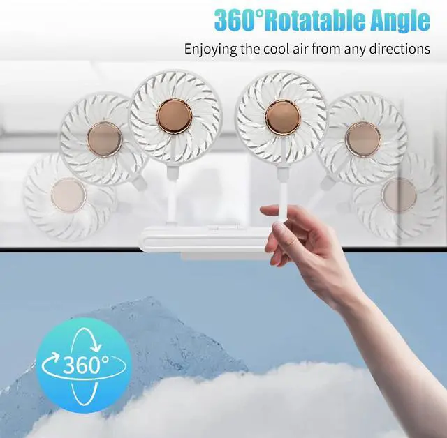 Clip On Monitor Fan with Light BarThis monitor fan is not only a fan, but also a lamp. With double heads, it's like having two tiny wind gods blowing a cool breeze while you work. The light bar ensures youre never working in the dark. Built-in LED white light design effectively reduces glare and reflection on the screen, thereby reducing eye fatigue. The lighting angle and brightness of the lights can be freely adjusted according to your needs, It has 3 adjustable brightness levels. ^^ 360 Rotatable Fan HeadsThe 2 heads of desktop fan can be adjusted 360 vertically and horizontally (Use the bendy rods below to easily adjust them individually.