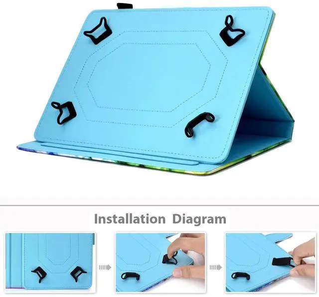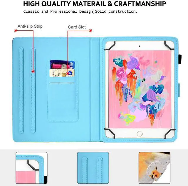 Product Description: - Our tablet case is made of premium PU leather exterior, prevents your tablet from daily bumps and scrapes. - Magnetic snap closure keeps the cover securely shut, protects your device effectively from being shocked and impacted. - Interior card holders are designed for you to store your business cards/ bank cards/ SM card. - Side with an elastic pen holder for holding your stylus conveniently, also bonus with a stylus pen. - Built-in 2 non-slip stripes for propping up your tablet with horizontal viewing angles securely, is convenient for movie-watching or video-chatting.