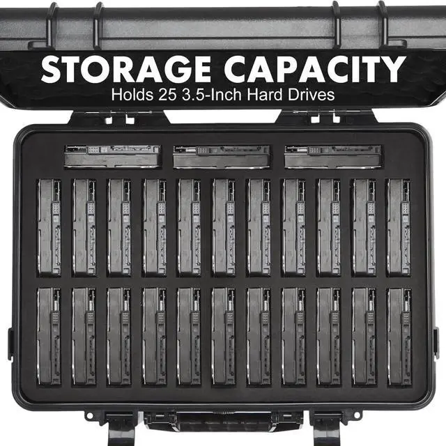 25-BAY LARGE CAPACITY The foam in the external hard drive storage box can holds up to 25 external hard drive. Each drive can be safely protected in 25 spaced foam in the box. ^^ 3.5" Customized Slotour HDD case have equipped upgraded High-Density Foam, which specially mold based on 3.5" hard drive size, securing the SSD&HDD firmly and prevent it from shaking. ^^ High-Strength MaterialsOur computer hard drive bags & cases organizer features a hard shell plastic casing, a highly reinforced frame, which has good shock-absorption, dust-proof and moisture resistance. ^^ Strong ProtectionOur hard drive storage box can achieve IP67 waterproof level, and the sponge slot can firmly fix the hard drive inside, preventing it from shaking.