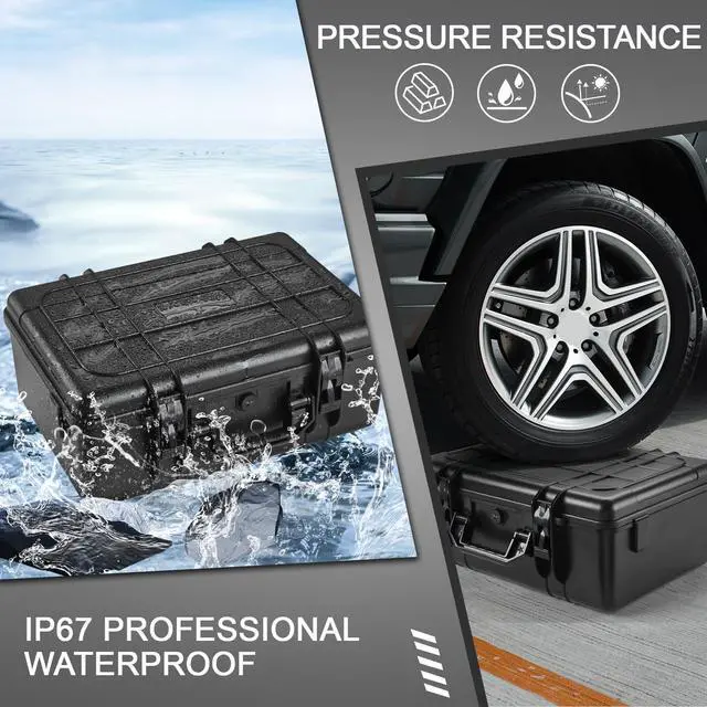 The outer hard shell of the box can withstand car crushing and has first-class anti drop performance. ^^ Safety Buckle & HandleThe case features a sturdy handle for easy carrying and a double safety buckle design to securely fasten the lid, preventing accidental opening or theft.