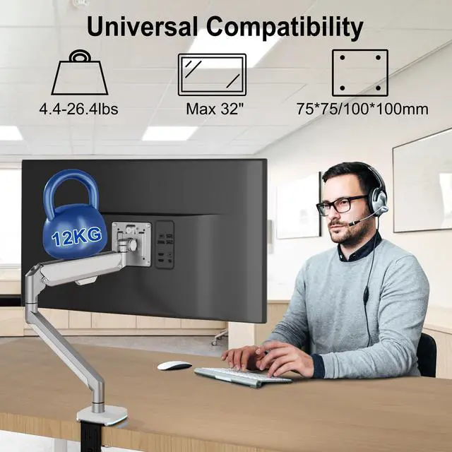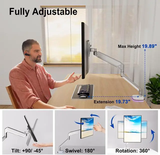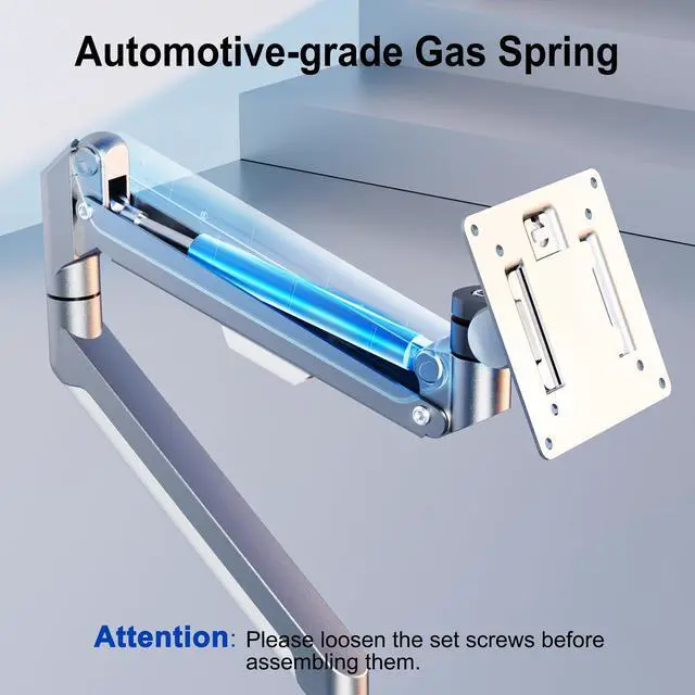 DESIGNED FOR HEAVY MONITORS: Gas spring monitor arms are made from high-quality materials. Its silver exterior design is not only visually appealing but also reinforces its impressive weight-bearing capacity, max load capacity can reach 26.4 lbs. This is superior to any other single arm monitor mount on the market.