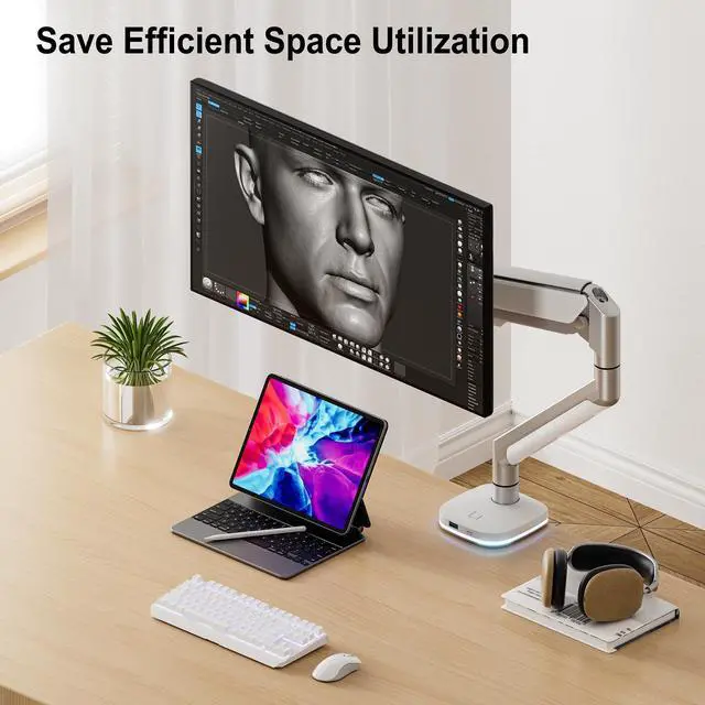 ^^ SPECIAL BASE: Adjustable Gas Spring Monitor Mount's base can not only light but also charge. Convenient and simple. Support both C-clamp and Grommet mounting for desk thicknesses up to 3.15". ^^