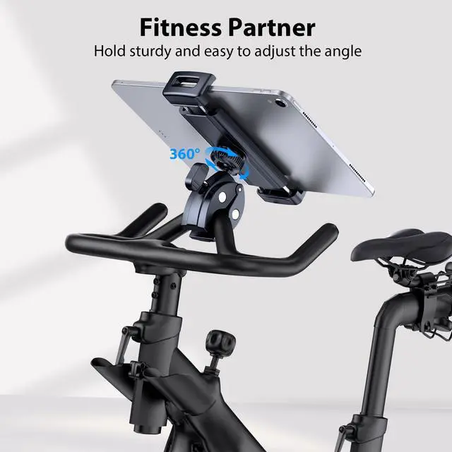 Firm: Constructed from durable materials (ABS + Metal + Aluminum Alloy), the tablet holder for spin bike features anti-skid silicone pads and a solid ball joint for maximum stability, ensuring your device remains secure during high-intensity workouts.