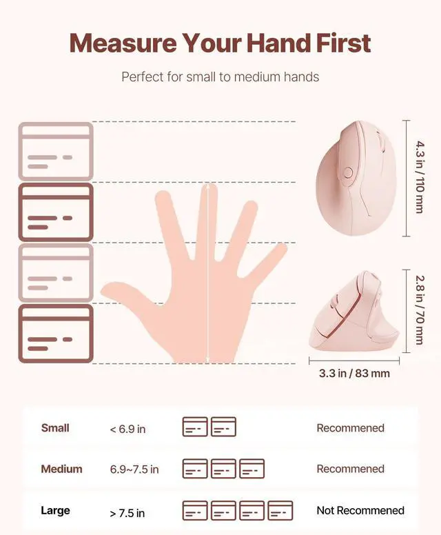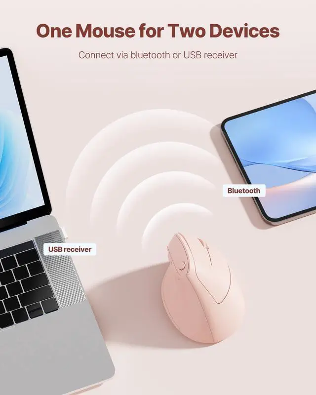 Connect 2 Devices Simultaneously-This ergonomic wireless mouse supports Bluetooth 5.0 and 2.4GH z USB-A modes, allowing you to connect up to 2 devices at a time and switch between them with a simple press. Compatible with Windows 7/8/10/11 or higher, Mac OS 10.12 or higher, and Android 4.3 or higher ^^ Reduce Wrist Pain from Long Hours-If you experience wrist discomfort from long working hours, this ergonomic mouse is perfect for you. It promotes a natural, upright wrist position and keeps your forearm relaxedhelping reduce strain and ease pain compared to a standard mouse ^^ Comfortable Fit for Small/Medium Hands-This ergonomic vertical mouse is specifically engineered for small to medium hands, providing a more natural grip and precise control.