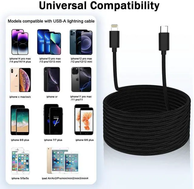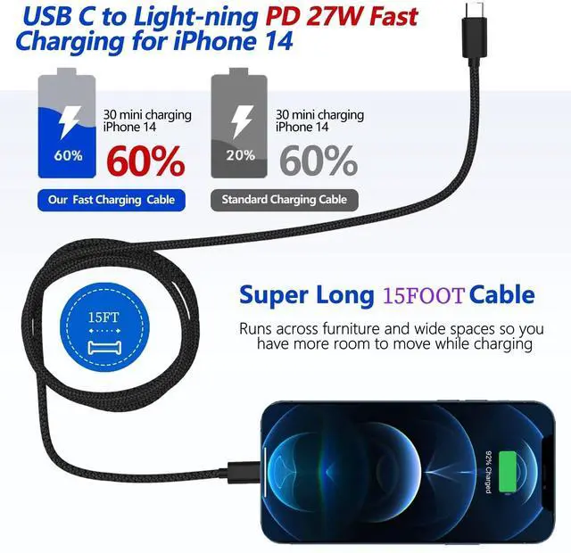 OFFICIALLY MFi CERTIFIED: Equipped with the original-grade smart chip, this cable guarantees 100% safe and stable connectivity without annoying "unsupported accessory" alerts. Supports up to 27W PD Fast Charging (requires a 30W+ PD charger not included), charging your iPhone up to 50% in just 30 minutes. ^^ Experience ultimate freedom with our extra long 15ft cable: Engineered with premium nylon braiding and reinforced stress points, it surpasses 30, 000 bend tests, ensuring it withstands daily twists and tugs without breaking. Perfect for using your i Phone while charging from a distant outlet.