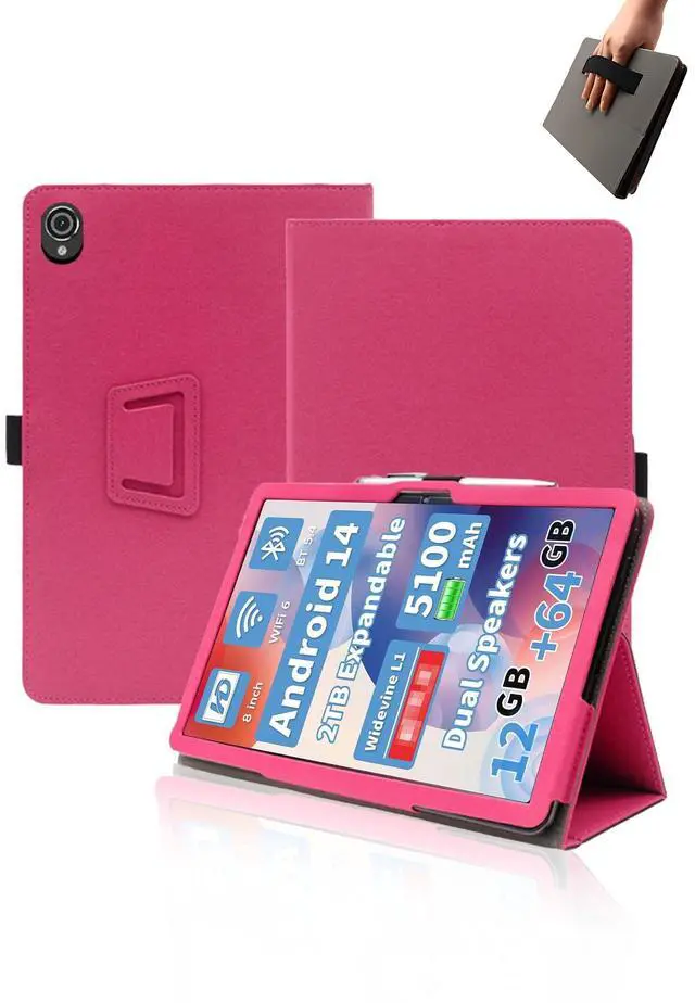 Case for HAOVM M8/HAOVM M8BK 8 inch Tablets Android 14 Tablet,UYRUREL Leather Slim Folding Stand Cover with Hand Strap Magnet for Men Women Full Protection,Rosered.