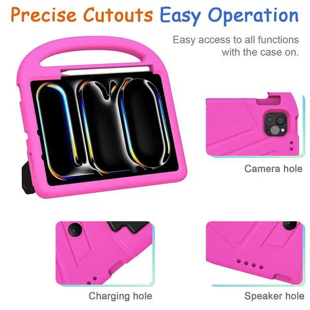 Features: Shock ProtectionMade of sturdy kid-safe EVA foam to protect your tablet from daily bumps and scrapes. Support iPad Pencil Wireless ChargingExtra opening make Apple Pencil Pro or Apple Pencil (USB-C) attach to the iPad Pro 11 and wireless charging without any hassle. Top HandleLarge handle is designed for an easy and comfortable grip, and convenient for carrying outdoors. Stable StandBuilt-in 2 folded bases to prop your iPad up on the table for hands-free horizontal viewing or typing.