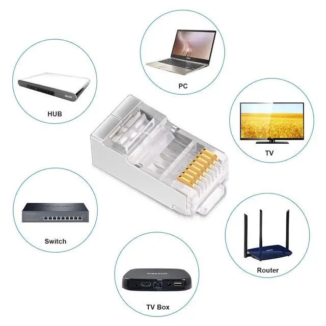 Gold Plated 50 Micron 50 8P8C Pins High Speed Data Transmission while 3 Prong Pins ENSURE Secure contact/connection. RoHS, UL and FCC compliant RJ45 Connectors.