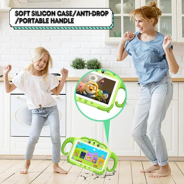 Case Handle: This tablet for toddlers are surrounded by kids friendly soft silicone case, which can protect screen from occasional drops or bumps. Both sides of the handle is specially designed to fit the child's small hands to hold. And it also be used as an adjustable stand for children to watch videos hands-free ^^