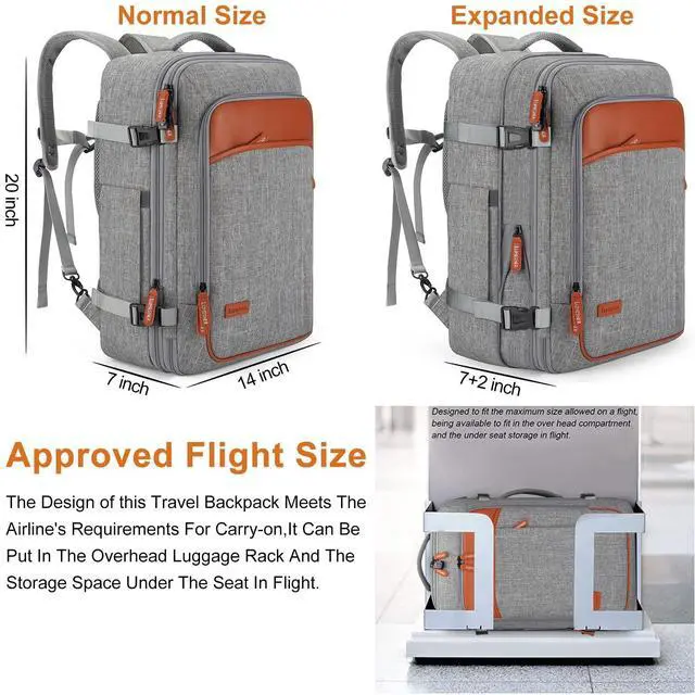 LARGE CAPACITY & EXPANDABLEThis extra large travel backpack with expandable feature offers you more packing capacity up to 42L. One separate laptop compartment hold 17 Inch Laptop as well as laptop accessories, textbooks. One spacious packing compartment roomy for daily necessities, clothes. Front zipper pocketx2, side pocket for water bottle or umbrella, back anti-theft zipper bag which can store valuables such as mobile phone or cards. These small designs keep your items neat and easier to find ^^ FLIGHT APPROVED CARRY ON BACKPACKThis versatile travel backpack meets the carry on requirements of most airlines, so you can put it under your seat or overhead bin to save extra money.