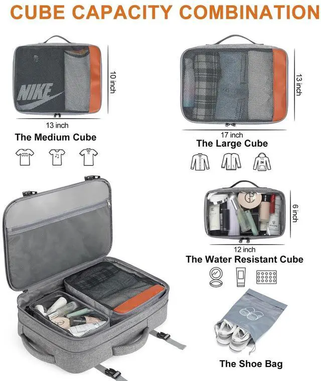 180 degree zipper closure helps you pass through the security check quickly. Perfect as an everyday backpack, laptop backpack and casual backpack for weekend getaway trips. Travel gifts for both men and women ^^ EXTRA 3 PACKING CUBES+1 SHOE POCKETThis weekend travel backpack comes with three packing cubes. large cube and medium cube for clothes, personal item. Small water resistant cube with transparent side for providing clear overview of Toiletries. there's also a shoe pocket. Keeping your belongings neater and more organized. Serve you well as carry on bags for airplanes, weekender backpack, personal item travel bag, overnight bag ^^ HUMANIZED DESIGNThe travel bag is made of high-quality water-resistant fabric, durable, anti-wrinkle, wear-resistant, and with sturdy metal zippers.
