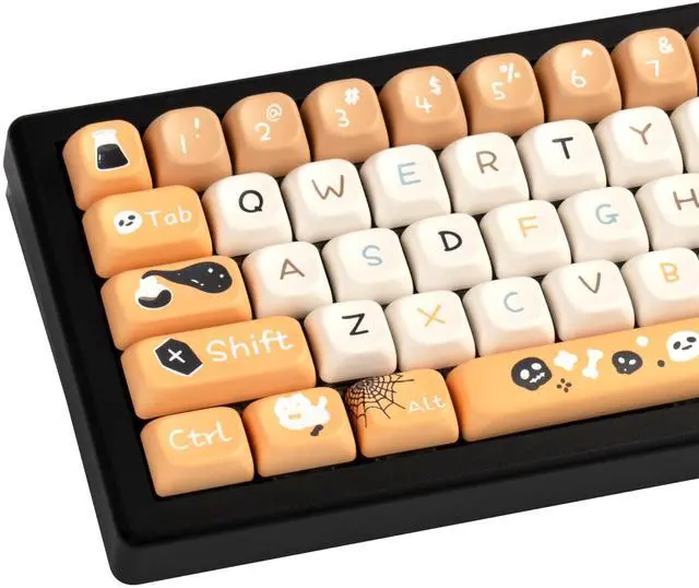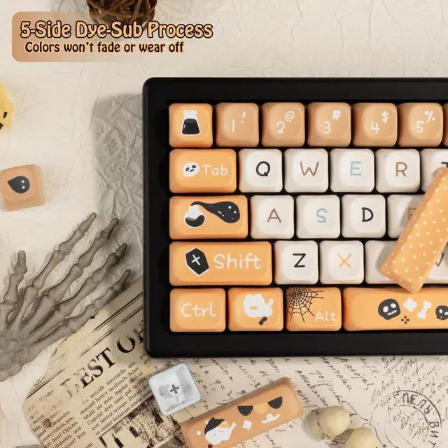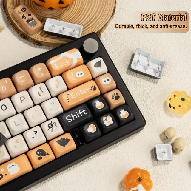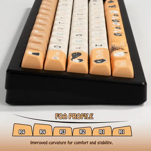 FOA Profile KeycapsFOA Profile keycaps are a kind of high performance mechanical keyboard keycaps, the edge line is more rounded and curved sense is stronger, its unique design make it has higher stability and feel ^^ NoteOnly keycaps, keyboards are not included. Using the included keycap puller, the precise fit design allows you to easily pull out and replace them. ^^ PBT KeycapsThese Halloween cute keycaps are made of PBT material, with a matte texture and anti-grease coating. These keycaps are resistant to wear and tear, thick and durable, fine workmanship, and not easy to get dirty ^^ Dye-sublimation ProcessAdvanced dye-sublimation technology allows the color to penetrate into the keycaps, making the font and pattern on the keycaps very clear and beautiful, giving you a premium experience ^^ Widely Compatible145 keys keycaps can be used for most cherry MX switch mechanical keyboards and any keys with "+"Switches, it can fit for 61/64/68/75/84/87/96/98/104/108 mechanical keyboard