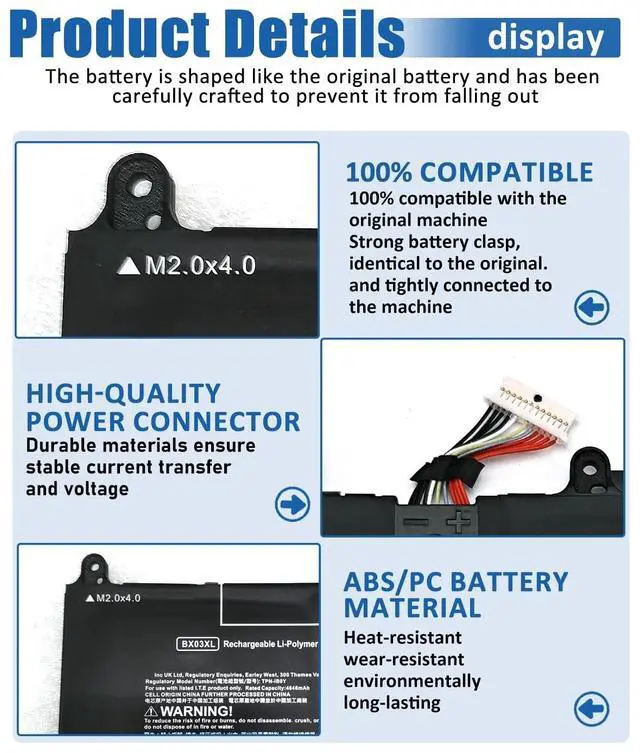 • Battery SpecificationsModel Name: BX03XL Battery, Voltage: 11.58V; Capacity: 56.04Wh/4646mAh; Color: Black. More than 500+ cycles, Packages includes: 1x BX03XL Battery ,1 Set x Screwdrivers,1x Instruction for BX03XL Battery