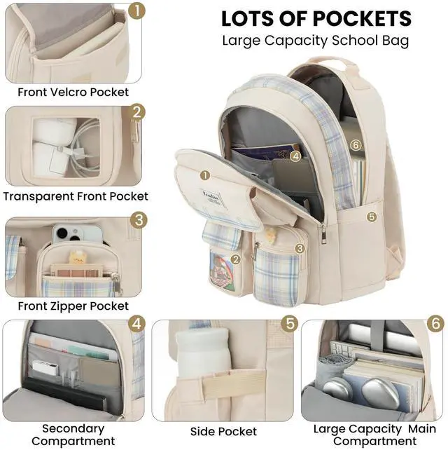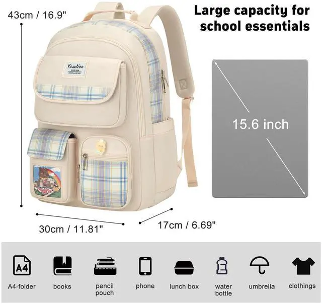 Large Backpack for TeensWith generous 16.9" x 11.1" x 6.69" dimensions, this school backpack swallows gear without bulk. Securely fits a 15.6" laptop, plus 3+ thick textbooks, a binder, lunchbox, and a hoodie. The expandable main compartment adapts to heavy semesters or light days, while padded shoulder straps distribute weight evenly. Ideal for students or weekend explorers. ^^ Smartly OrganizedRoomy main compartments and multiple pockets to keep all of your gear secure and organized; Beyond the shock-absorbent laptop sleeve, discover