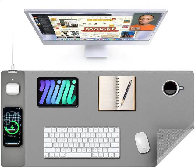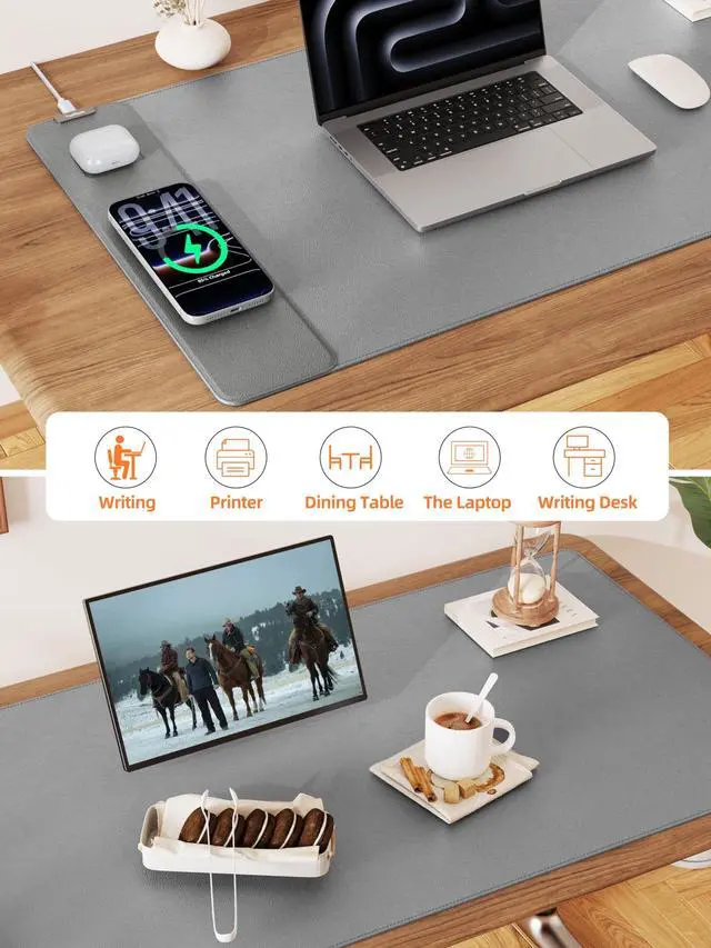 3-in-1 Extra Large Multi-Functional Mouse Pad for Desk 31.5 x 15.7 inches large enough to hold a laptop, mouse and keyboard, and it combines the 3 functions of phone charging, AirPods charging and mouse pad, allowing you to charge your phone and AirPods while using the mouse pad, no need for extra cables to clutter up your desktop, comfortable and smooth surface can also be used as a mouse pad, desk mat, desk blotters and writing pad ^^ Max 15W Fast Qi Wireless Charging This wireless charging desk mat provides up to 15W fast charging for Samsung Galaxy S23/S22/S21/S20/S10/S9/S8/Note 9/8, iPhone 17/16/15/14/13/12/11/X/8 series, Airpods Pro 2nd/Pro/4rd/3rd/2rd (only for wireless charging case) and other Qi-enabled devices.