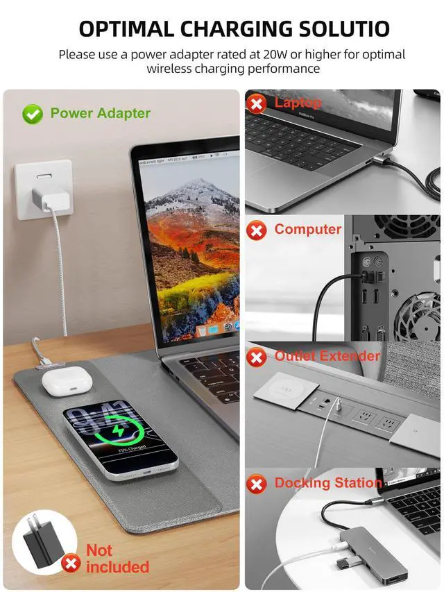 Not compatible with any Apple Watch model! Please note that 15W fast charging requires 9V 3A power adapter, which is not included in the this mouse pad package ^^ Designed for MagSafe The round raised magnetic charging area has built-in powerful magnets that makes it easy to align the wireless charging position to charge your device, compatible with iPhone 17/16/15/14/13/12 series, AirPods (MagSafe wireless charging case), and all Qi-enabled devices with MagSafe cases; the AirPods charging area is non-magnetic ^^ Ultra-Smooth & Waterproof SurfaceThe surface of this gaming mouse pad is made of smooth and durable PU leather, the texture is close to genuine leather, which not only ensures that you can control your mouse accurately and glide smoothly, but also protects your desktop from scratches, stains, spills, high temperatures, and abrasions, and you only need to wipe the surface with a rag when cleaning ^^ Non-Slip PU Base The soft and non-slip PU base can keep this desk mat provides excellent grip and keeps the mousepad firmly in place on your desktop, so you can simply immerse yourself in your work or game without worrying about the annoying mouse pad moving around ^^ What You Get Wireless Charging Mouse Pad x 1, 6.56 ft White USB-C to USB-C Woven Cable x 1, User Manual x 1, 24 hour friendly customer service and 12 months of full technical support