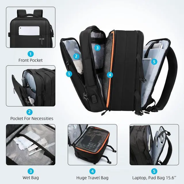 ^^ MULTIPLE COMPARTMENTS: The carry on backpack has a separate laptop compartment that fits 15.6" computers and keeps the laptop from moving; the double zippered main compartment has plenty of room for your books or everyday essentials for back to college or overnight trips; organization compartments, many pockets to keep your items organized and easier to find; and many other pockets for different purposes. Men's backpacks are great gifts for business men. ^^