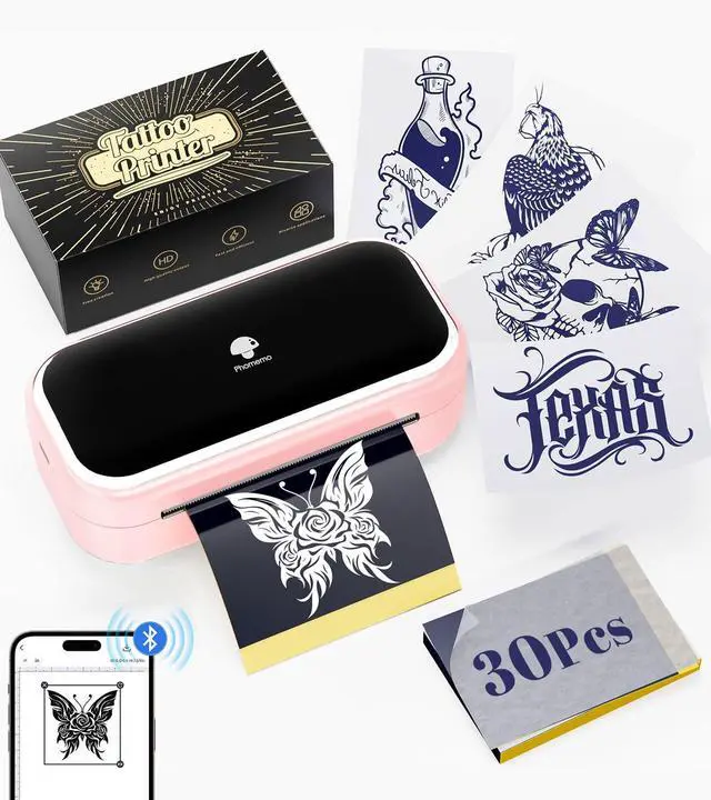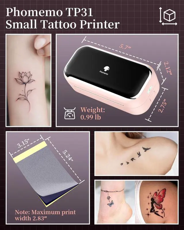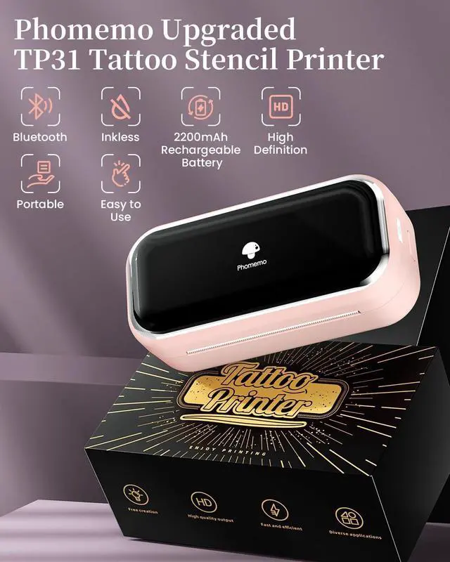 Portable Tattoo Printer: Phomemo TP31 Bluetooth tattoo stencil printer built-in 2200mAh high-capacity rechargeable battery, prints up to 330 pages per charge. Weighing only 0.99 lb and compact, it's 40% lighter than other portable tattoo printers. In addition, TP31 thermal tattoo printer kit comes with 30pcs tattoo transfer papers ^^