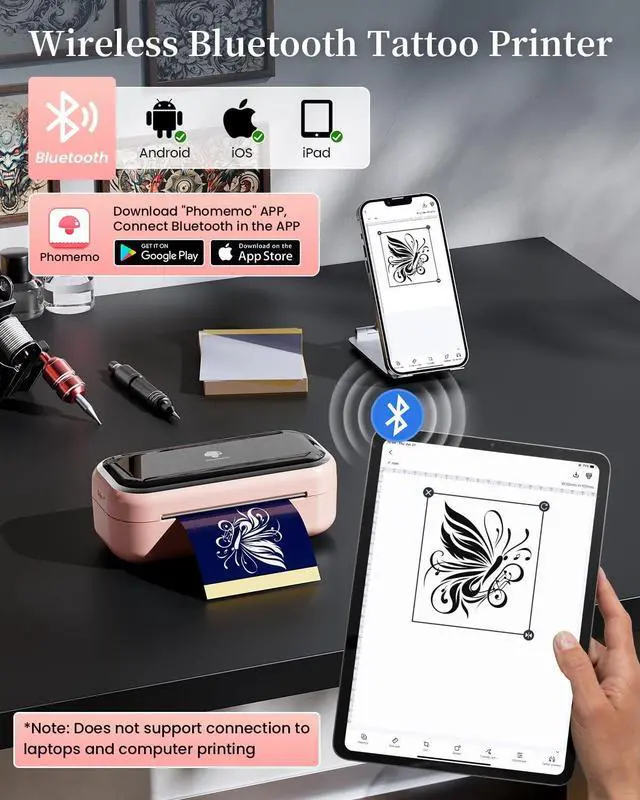 Good Compability: Phomemo TP31 tattoo printer machine supports Phone and Tablet (iOS & Andriod Systems) via Bluetooth. TP31 thermal stencil printer allows tattoo artists and beginners to print tattoo stencils in 1 minute, easy to use on the go (Note: TP31 is not compatible with PC or Laptops) ^^
