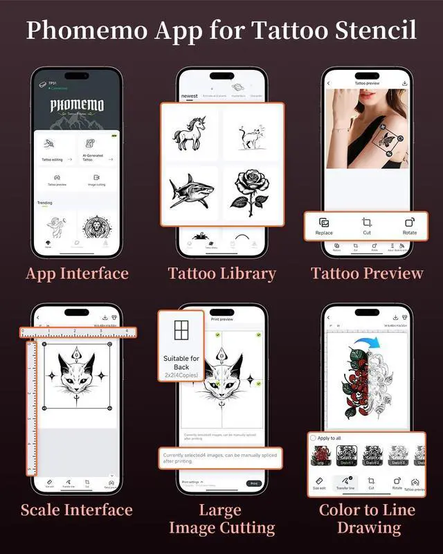Powerful App: Phomemo App enables one-click printing of images and documents, provides a wide selection of tattoo stencil templates, and offers efficient functions including tattoo preview, image cutting, transfer lines, AI tattoo design and so on ^^ Specifically Designed for