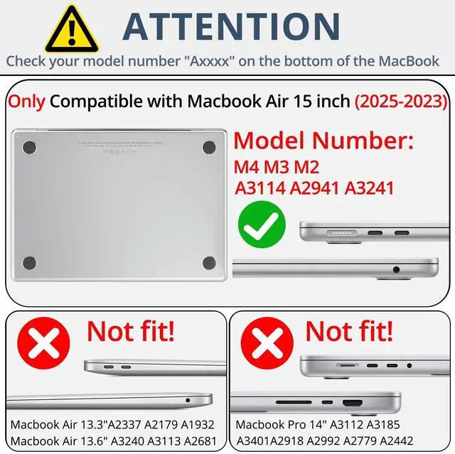 COMPATIBLE MODELSOnly Compatible with MacBook Air 15 inch 2025 2024 2023 released (Model: A3241/A3114/A2941) with M4/M3/M2 chip, Touch ID and Liquid Retina Display. NOT for MacBook Air 13.6 inch& 13.3 inch, please double check your laptop's model number "Axxxx" ^^ PREMIUM MATERIALDesigned for MacBook Air 15 inch case is made of high-quality hard plastic materials with good abrasion resistance for protecting your laptop from everyday scrapes, dirt, smudges and other damages. Easy to clean and make your laptop always looks like new ^^ UNIQUE PRINT DESIGNThe case for Mac Book Air 15 inch M4 M3 M2 is characterized by exquisite pattern which feeling of undulating waves, unique and eye-catching, make your case stand out of the crowd! The print is delicate and durable, and will never peel off or fad ^^ ACCESS TO ALL PORTSPrecise cutouts allow to access all functions and controls easily. Plug your charger, cable or headset without removing the case. Aside from regular port cut-outs, the bottom of the cover is designed with two rows of vent slots for proper ventilation ^^ 3 IN 1 COMBINATIONOne set fits for all needs.