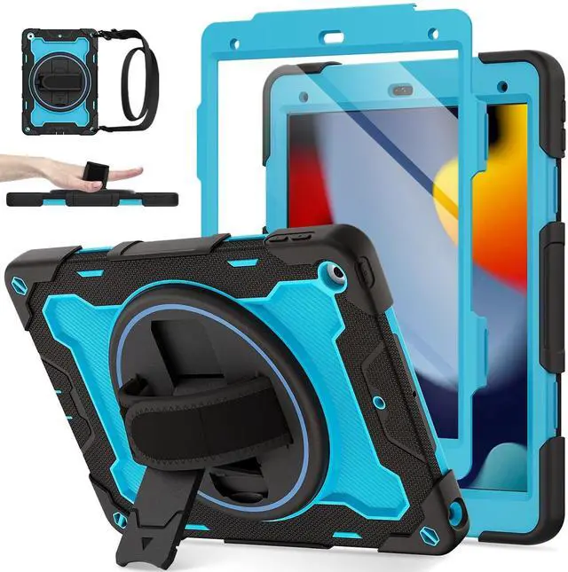 Not only increase ten times shockproof impact resistance, but also increase extra dissipate heat by upgrade built in soft endothermic sponge ^^ [360 Rotating Kickstand / Hand Strap] Multiple angles kickstand and hand strap suit for all kinds of group, such as toddler / children / kids, make money people at office/restaurant / school / warehouse / outside, students at elementary school /middle school/ high school /university, senior people at home, and another people ^^ [Built-in Screen Protector+Detachable Shoulder Strap] Raised edges on the screen protection + have built in screen protector protection, truly made work to protect screen of iPad 9th/8th/7th gen from scratching and breaking.
