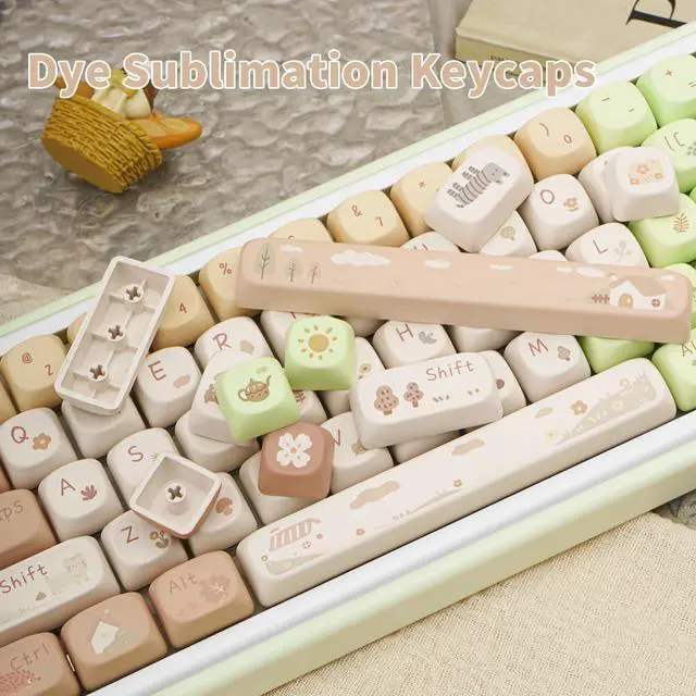 1. COOMICKEY MOA Profile Keycap SetFeaturing a lovely pattern in pink and white, these MOA keycaps have rounder edge lines and stronger curves for a refreshingly comfortable typing experience2. PBT Material & Dye SublimationCrafted from high-quality PBT material, these keycaps offer a matte texture that feels smooth yet durable under your fingertips. The advanced dye sublimation technology ensures vibrant colors and patterns that are vivid and resistant to oil stains, maintaining their beauty and clarity for years to come. Say goodbye to fading and hello to long-lasting quality3. Enhanced Typing ComfortThe MOA profile design is not just about looks; it's engineered for superior comfort and stability.