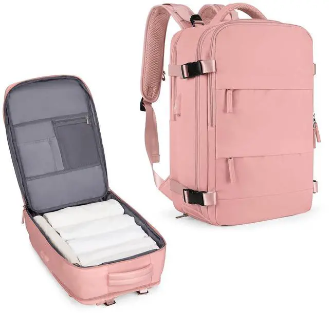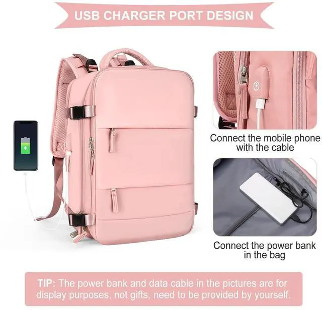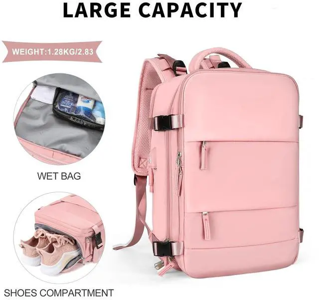 Large Upgraded VersionSize: 30L; Increase capacity, improve comfort and relieve back pressure. ^^ Large Travel Backpack for womenThis backpack is made of waterproof durable polyester, good air permeability and heat dissipation with two padded shoulder straps, offers lightweight carrying and of force reinforcement, keeping cool when you carry it for a long time. And it is tough, firm and does not fade. ^^ Separate shoe compartment design and wet pocketMain pocket x 2, laptop compartment x 2, and many other pockets for different purposes. Wet bags are made of high-density waterproof material to help you separate wet and dry items, and if you have wet clothes or towels, you can put them in the wet bag. A separate shoe cabinet can help you better carry your shoes and store them in your travel bag. ^^ USB Charging PortBuilt-in charging port to charge your phone anytime, anywhere. (The power bank and data cable in the pictures are fodisplay purposes, not gifts, need to be provided by yourself) ^^ Anti-theft Multifunctional BackpackThere is a zipper pocket on the back of the bag, which can store valuables such as mobile phones and iPads, which is anti-theft and convenient.