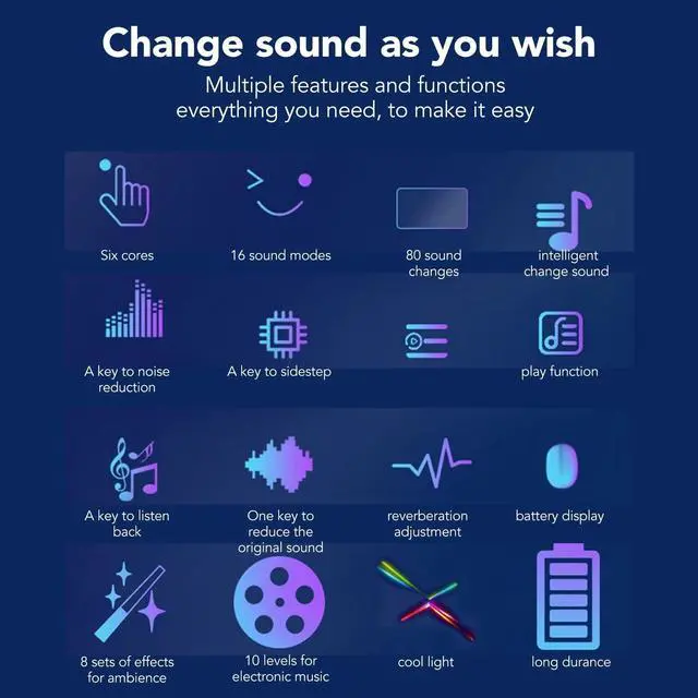 Sound Effects: Comes with 8 entertaining sound effects, just press the for each sound to get interesting sound effects, that is applause, kiss, laughter, delight, surprise, fright, crow and time. The LED lights of the phone sound changer, which has a separate to control.