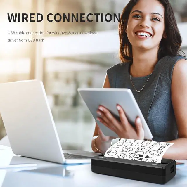 Note: This portable printer has no WIFI connection, only supports Bluetooth connections with phones and tablets, laptops cannot connect via Bluetooth (only via USB cable)