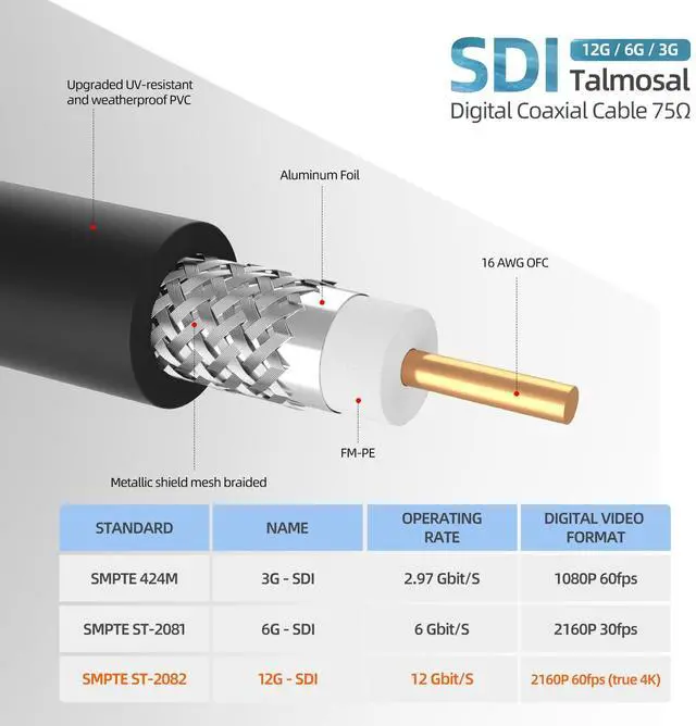 Cable: The resolution of Talmosal 4K SDI cable support HD-SDI/3G-SDI/6G-SDI/12G-SDI, BNC to BNC Digital Video Cable. 12G SDI Cable 200ft. ^^