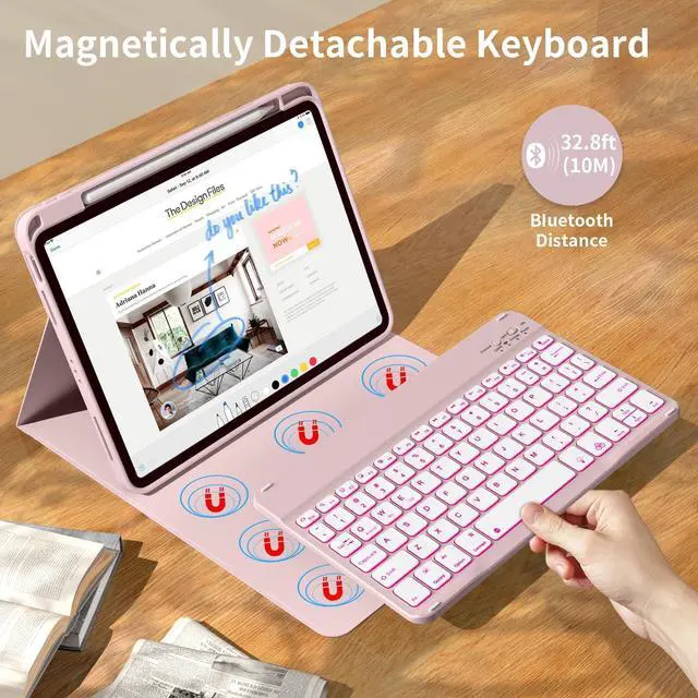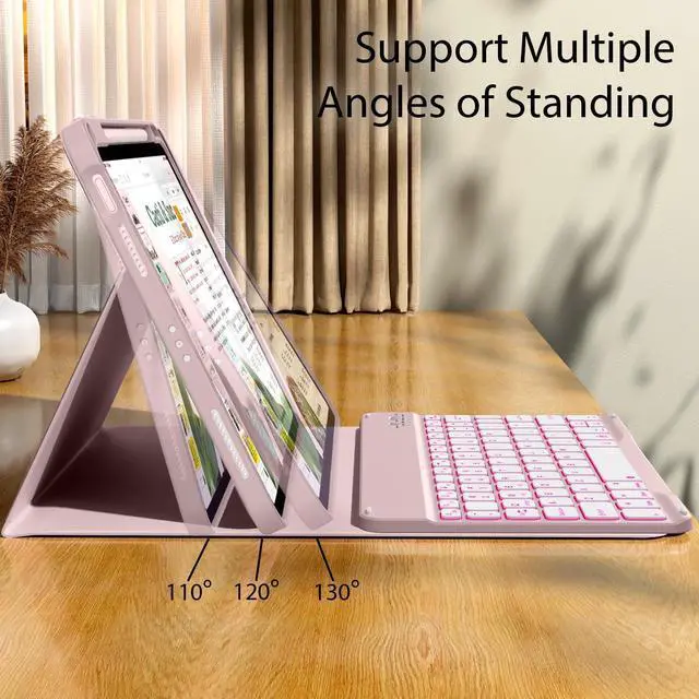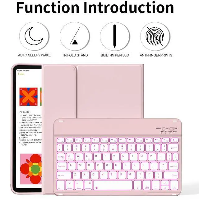 The protective shell can be placed at different tilt angles to adjust the optimal viewing angle, very flexible and user-friendly. ^^ Buit-in Pencil Slot & Sturdy PU MaterialThe ipad 11/10th generation keyboard case has a convenient right side built-in pencil slot that easy to storage and remove your pencil (Apple Pencil is Not included). Premium PU leather cover is waterproof, scratch proof and fingerprint proof, providing full protection for your beloved tablet. ^^ Practical 7-Color Backlight KeyboardThis keyboard has 7 LED backlight colorssingle color/breathing lightand 3 brightness options. The square keycaps are very classic and personalized.