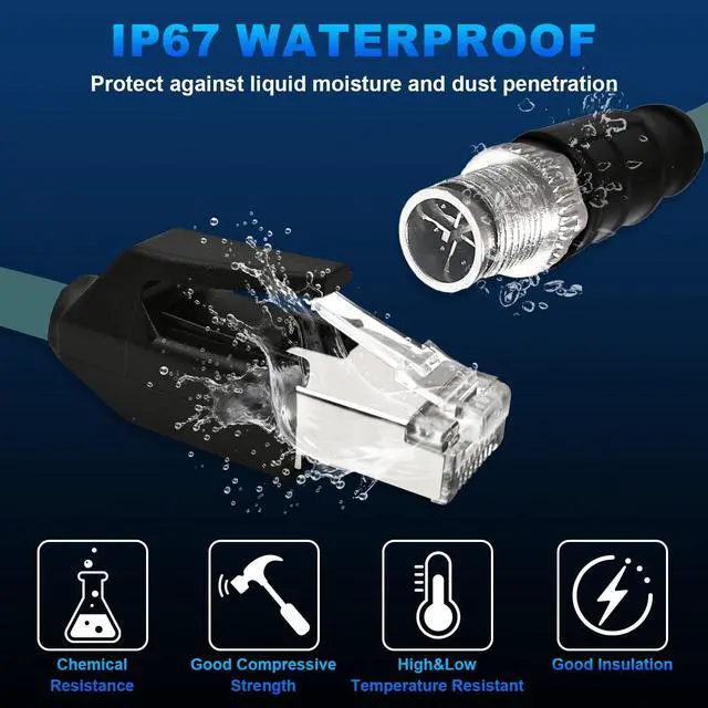 IP67 waterproof for harsh environments; Designed specifically for industrial applications, this M12 X Code 8 Pin Male to RJ45 Ethernet cable features an IP67 waterproof rating; It prevents liquid moisture and fine particles from penetrating the cable, making it ideal for use in harsh conditions and ensuring long-lasting performance in vario
