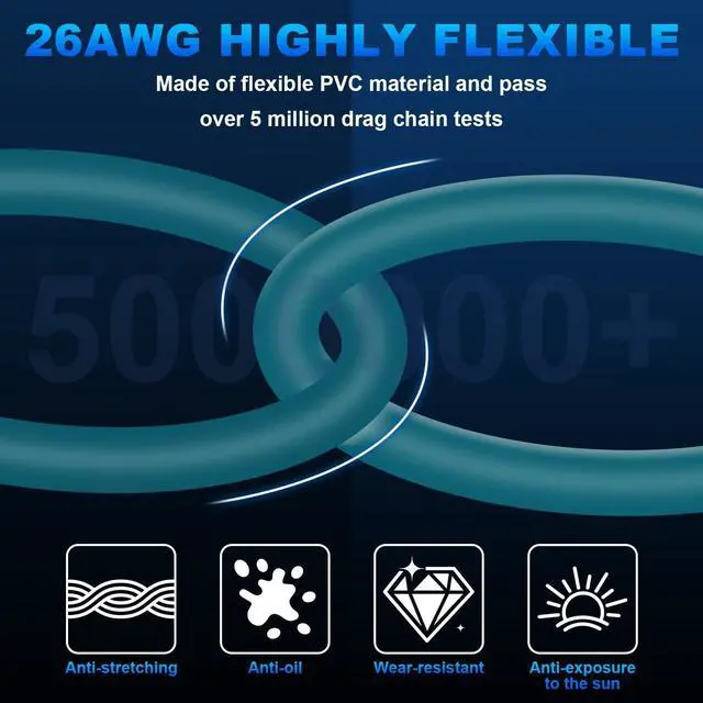Sturdy and highly flexible PVC cover; The outer jacket of this industrial Ethernet cable is made of flexible PVC material; its resistance to stretch, oil, and abrasion makes it the ideal solution for harsh environments, while also ensuring longevity and reliability