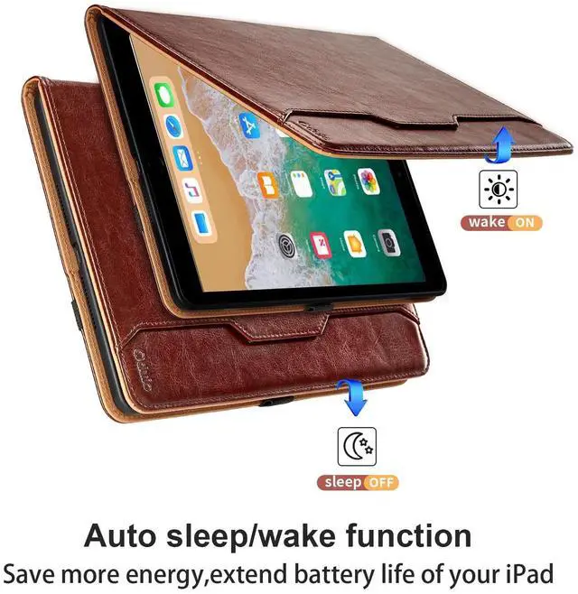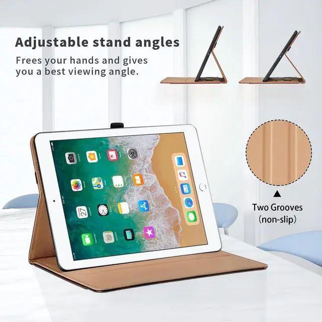 Air1 (Model: A1474/A1475/A1476). Please check your iPad model number before the purchasing. ^^ Full ProtectionThe ipad 6th generation cases adopt premium synthetic leather material to protect your tablet from scratches, dust, or any other daily damage. Come with elastic hand strap help secure the front cover with the back shell for outstanding full protection when close the front cover. ^^ Auto Wake/SleepThis ipad 5th generation case supports automatic sleep/wake function. Easy to use, protects and extends battery life. ^^ Multi AnglesThis ipad case 6th generation provides two anti-slip slots which able to adjust most comfortable angles for watching movies or typing. ^^ Large PocketThe 9.7 inch ipad case featured as large front document card pocket for notes, cash, and cards etc, with a built-in magnetic closure to prevent loss, perfect for carrying while shopping or traveling.