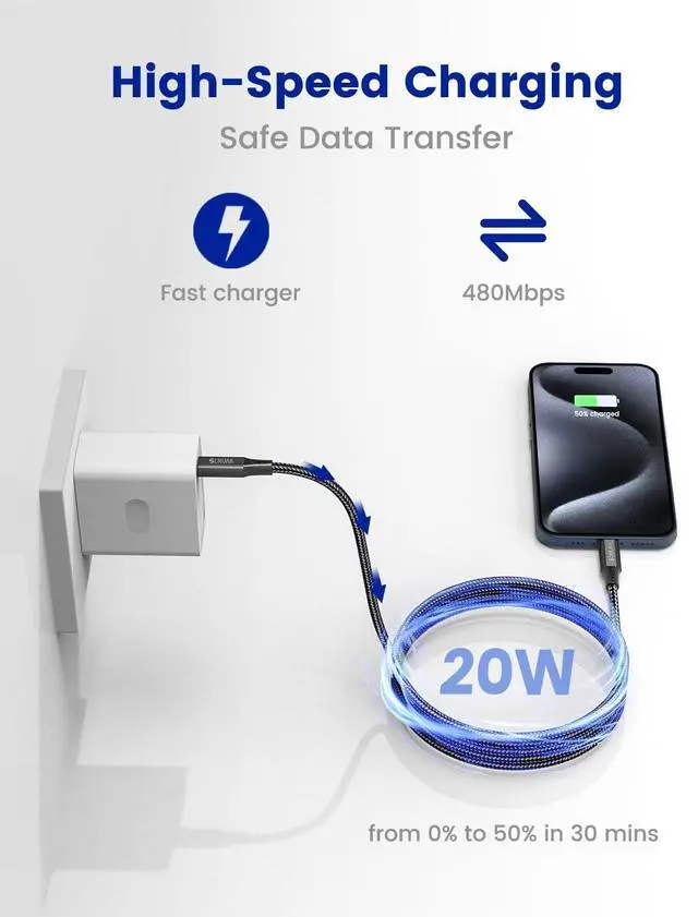 Super Long iPhone 17 Series Fast Charger Cord20FT/6M NylonPD Fast ChargingSupports high-speed PD charging for your Apple 17, 2.5 faster than USB A iPhone 17 cable. Safe Data TransferSupports data transmission up to 480Mbps, ensures the safety of your Apple devices to easily transfer music, files, pictures and videos between iPhone and MacBook. Nylon Braided iPhone ChargerThe 20 feet extra long iPhone 17 charging cord has a durable nylon braided design, sturdy nylon fiber cover makes the cable more durable, bendable, and makes it has extremely high resistance against wear and splitting, and gives it a more stylish and elegant appearance.