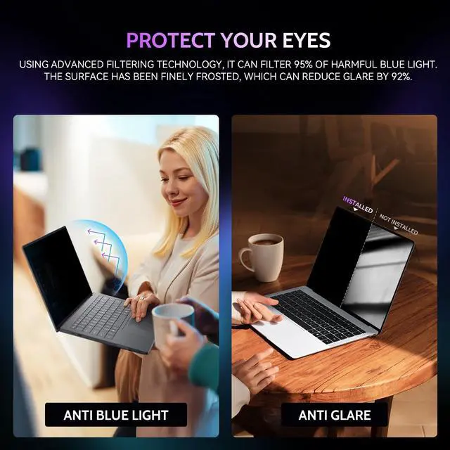 Self-developed anti-blue light filter layer process, blue light blocking rate of up to 93%. Keeps you away from light pollution and protects your eyes and eyesight. ^^ QUALITY MATERIALS AND WORKMANSHIPThe 16 inch privacy screen protector is made of premium PET material as the substrate, which is soft, tough, and scratch-resistant. Using die-cutting tools accurate to 0.01 mm, it is ultra-thin, precise in size. You'll get a high-definition, durable 16 inch laptop privacy screen protector. ^^ EASY INSTALLATIONThe adsorption layer of the 16 inch computer privacy screen is made of nano-silica material, which can automatically absorb, and remove air bubbles. you can easily complete the installation. Peslv is a factory that integrates production, processing and sales, and we are committed to making you more satisfied. Buy with confidence.