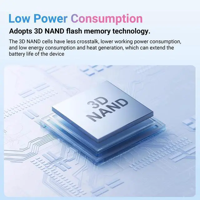 Low Power Consumption: The 3D NAND structure is like building a vertical skyscraper for data, with cells orderly arranged and minimal interference. This allows it to process data like a logical, precise, and calm brain, completing all tasks with extremely low power consumption, "whispering quietly, " and reserving more energy for thinking (CPU) and creation (GPU) rather than wasteful heat generation and consumption.