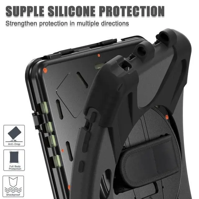 Designed for Samsung Galaxy Tab Active5 PRO (SM-X350/SM-X358) and Samsung Galaxy Tab Active PRO 10.1 Inch (SM-T540/T545/T547) and Samsung Galaxy Tab Active4 PRO (SM-T630/T638) tablet. ^^ Heavy-duty protective case features an advanced triple-layer design combining a polycarbonate hard shell with flexible silicone, engineered to withstand accidental drops, impacts, and shocks. ^^ Cover built with 360 degrees rotatable kickstand for convenience to typing and video watching. ^^ Case built with hand strap Ideal for workers to work with tablet. ^^ Adjustable removable shoulder straps. According to any need, remove the shoulder strap or the length can be easily adjustable, you can carry your tablet like a carrying bag.