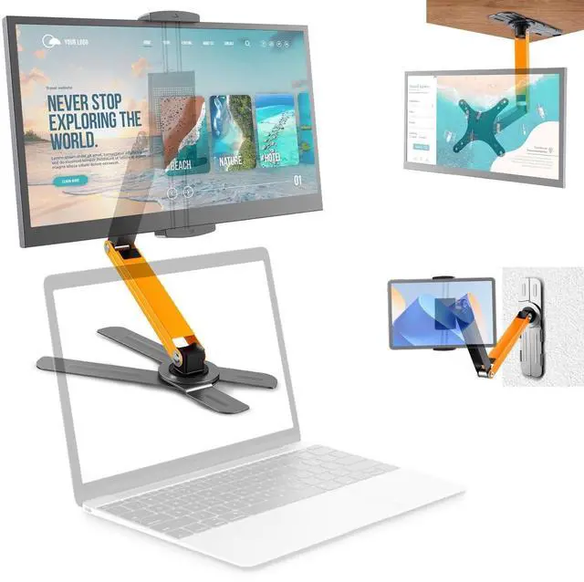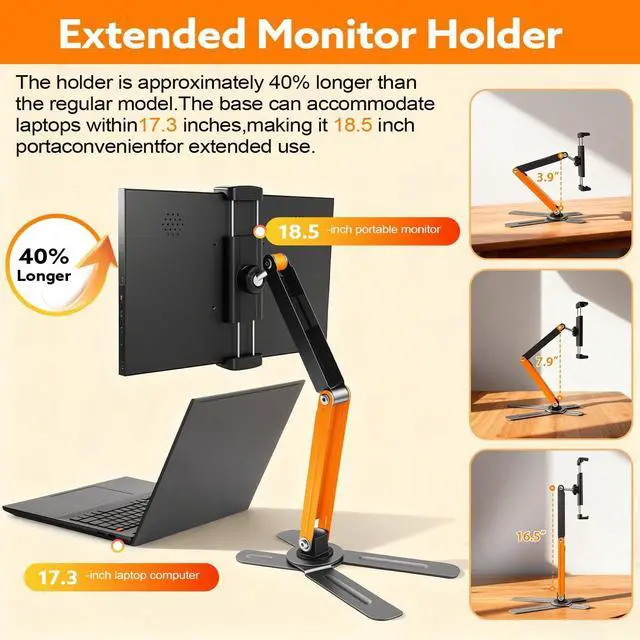 Comfortable Design: This upgrade portable monitor stand height adjustment up to 16.5 inch, Extend the bracket arm by 40%, significantly increase the lifting height of the monitor, and the bottom can accommodate a maximum 17.3 -inch laptop, making it convenient for expansion use. ^^ Big Clips&VESA