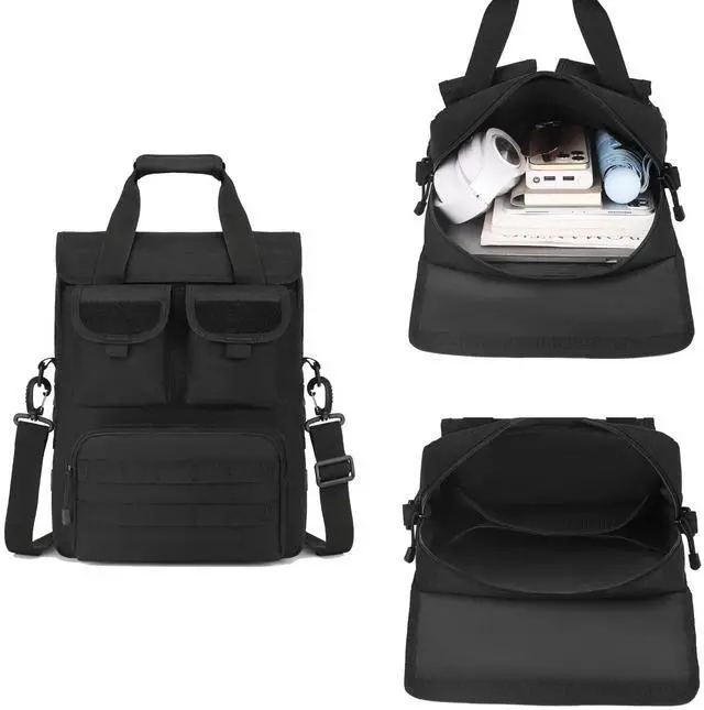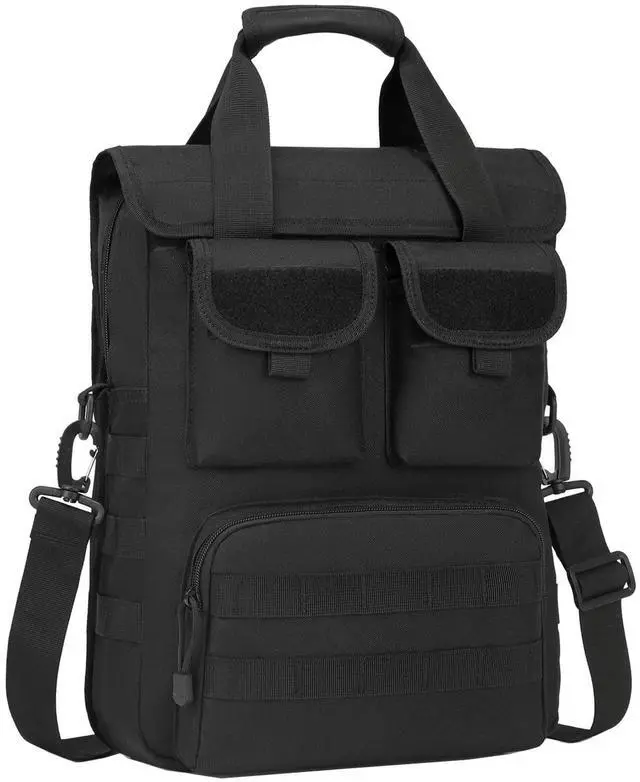 Carry/handbag) ^^ 3: With Molle webbing platforms on front and sides for customization with pouches and attachments. Padded compartment on the front, sides, back and bottom to protect your Laptop and devices from accidental ^^ 4: Functional pockets in different sizes are sufficient to meet your basic office needs. The zippered main pocket with a flap can carry 14" Laptop, magazines, water bottles, etc. Two pockets on front are easy to get to and good for holding small frequently used items like keys, cigarette and lighter, tissue. The zippered pocket on front can be used to hold cellphone, wallet, multi-tool. The pocket on backside can hold Pad mini, documents.