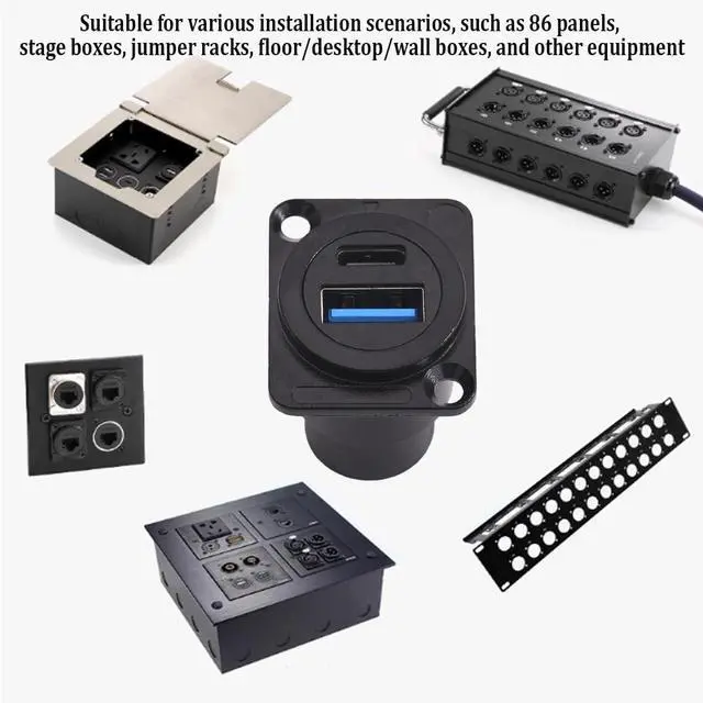 ^^ Applications -- This dual USB port (USB 3.0 +USB-C) connector can simultaneously connect 2 USB devices for data transfer or charging, making it ideal for use with smartphones, laptops, tablets, and other devices with USB-A&Type-C ports. In addition, the D-panel design is suitable for open or concealed mounting on XLR panels, equipment panels, patch panels, cabinets, desktops, and walls.