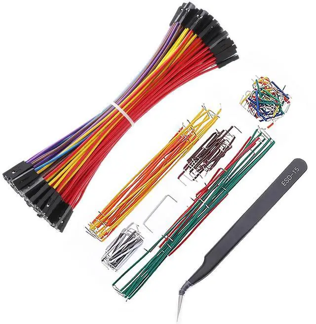 Lengths Assorted Jumper Wires: Designed to work well with any breadboard projects, all the colored jumper wire are solid and pre-stripped, easy to insert it into breadboard, which also come with a free plastic box to keep them organized, convenient to store and fetch. ^^ Angled ESD Tweezers And Rubber Bands: An angled head ESD Tweezers is included so you can easily fetch electronic components and small lengths preformed Jumper Wires. AND several RUBBER BANDS are prepared for collecting back the 20AWG Jumper Wires after use, just makes it neat and keeps in good condition for next use.