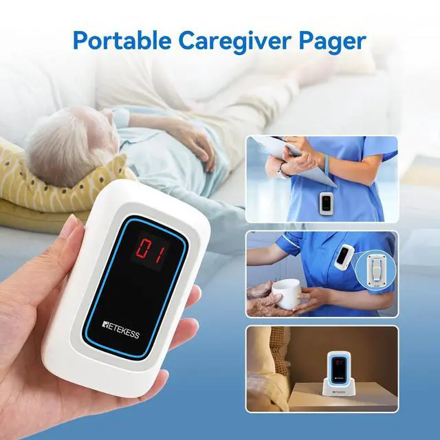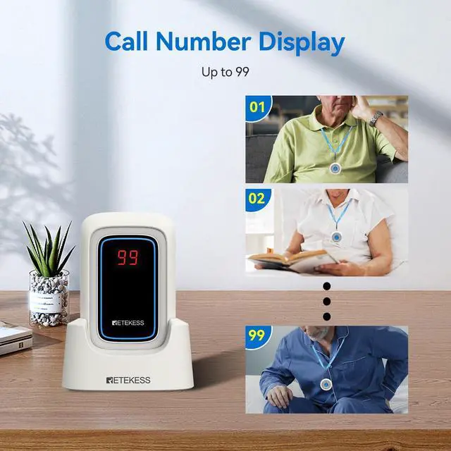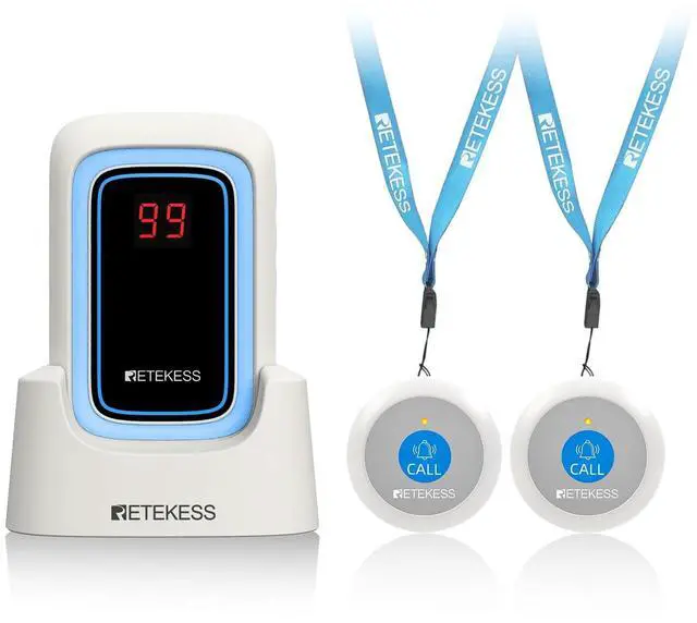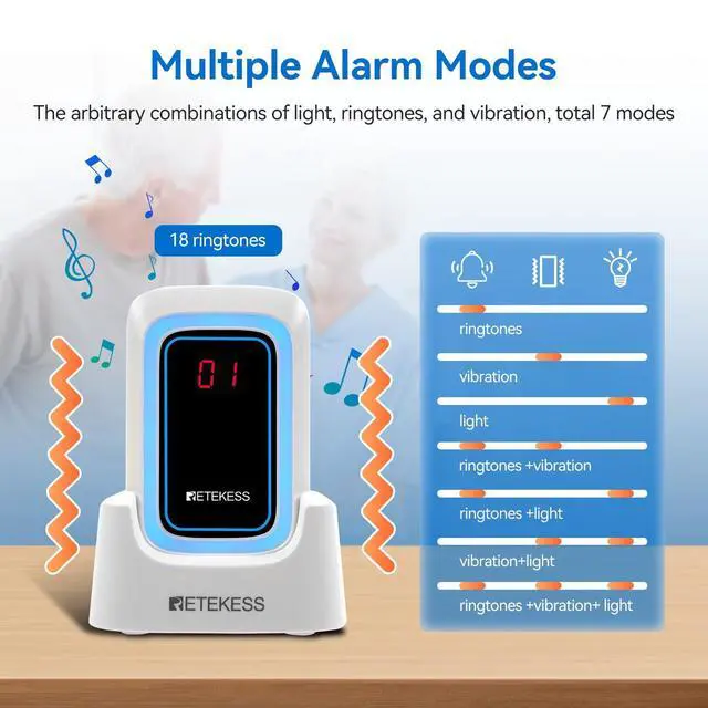 Power off memory; Retekess TH109S wireless calling system maintains the settings through power failures; allowing for seamless continuation of emergency preparedness; continuity of settings even during unexpected power outages ^^ Two charging options; the convenient charging base ensures a quick and easy recharge; while the universal type-c port caters to convenience; making the wireless call bell system effortless to stay powered up in diverse situations ^^ Different ringtones; the nurse alert system featuring 18 specialized ringtones organized into 6 intuitive categories; the versatility of these tones allows for assigning specific alerts to various threats; ensures immediate recognition and response ^^ Volume adjustment; the caregiver pager boasts a versatile volume system; ranging from 0db to a 120db; transforming the emergency calls into unmissable alerts; command immediate attention ^^ Easily portable; boasting a lightweight design and included accessories like a base; clip; and lanyard; ensuring never without a way to call for help