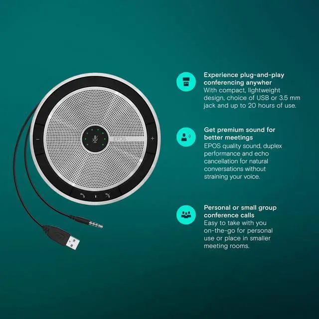 Sennheiser SP 20 is a compact, portable speakerphone designed for Unified Communications business professionals to make personal or small group conference calls via PC, mobile phone or tablet. With its iconic design, Sennheiser SP 20s lightweight slim profile makes it the ideal working tool for the quality conscious business professional. The superior audio performance of the speakerphone enhances efficiency and the quality of collaboration in and between organizations. In addition, the speakerphone features a dedicated music setting for relaxing with music between calls. Choosing the right