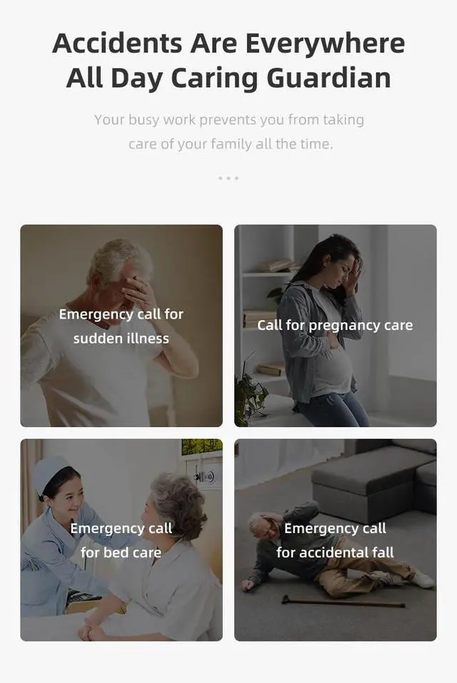 Enhanced Elderly AssistanceOur caregiver call button system is effortlessly set up and user-friendly, making it ideal for elderly care at home or as a thoughtful gift for parents. When a fall occurs, prompt notifications are sent to your smartphone, ensuring timely intervention, and maintaining detailed records for your peace of mind. (Only Supports Wi-Fi 2.4GH z ) ^^ Overcoming Distance BarriersExperience the freedom and reassurance of our smart life alert system, which seamlessly transmits call signals over long distances. Stay connected and remotely monitor the safety of your loved ones anytime, anywhere, providing invaluable peace of mind for your family.