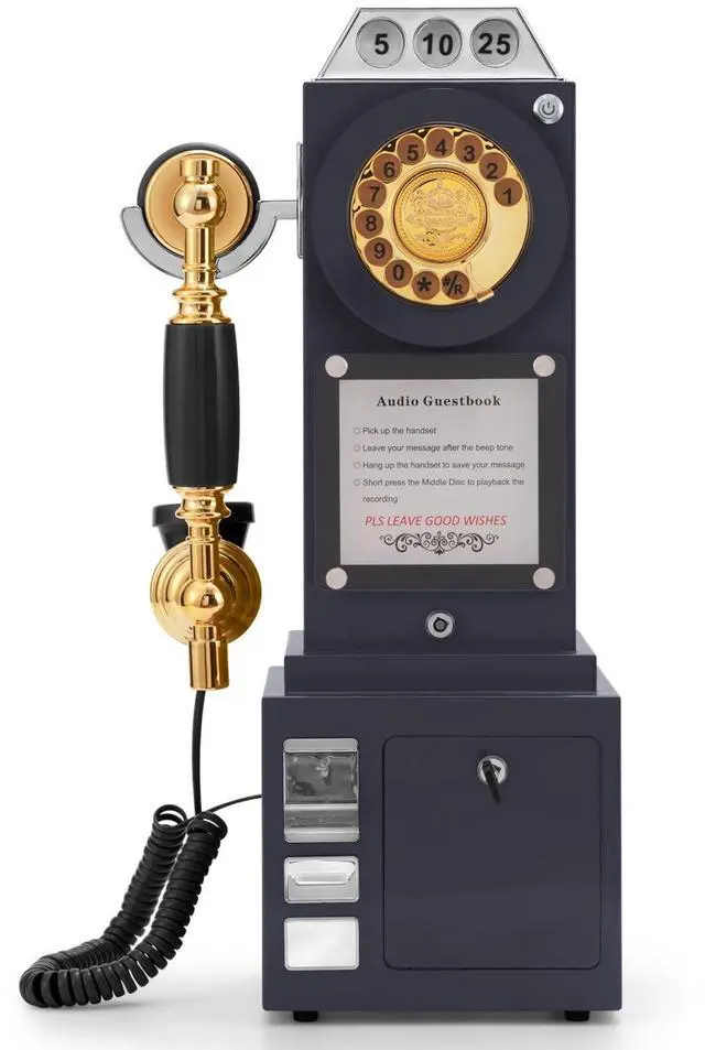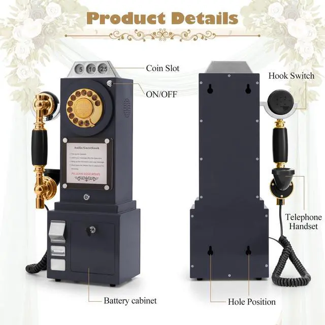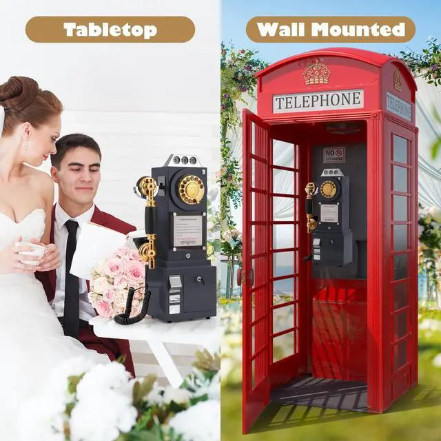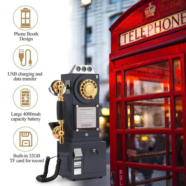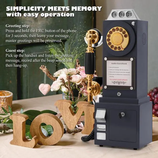 Vintage Audio Guestbook: Fashioned in the style of an vintage replica pay phone, the Audio Guest Book Phone has exquisite, stylish appearance, functions as an audio guest. No language barrier caters to every guest, Every message is a precious souvenir, You can hear these most memorable voicemails forever. ^^ Novel Design,